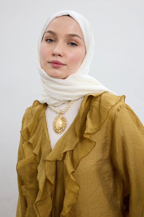 Oval bir yüz hattına sahipseniz pek çok şal modeli sizin için uygun olacaktır. Dilerseniz şalınızı yan kısımlarından kıvırarak daha yuvarlak bir görünüm elde edebilir, dilerseniz de bonenizi hiç göstermeyecek şekilde saç diplerinden bağlayarak yüzünüzü daha uzun gösterebilirsiniz. Bu tarz bağlamalar için yumuşak ve form alabilen kumaşlar tercih edilmelidir. Qef’in modal şal koleksiyonu, hafif dokusu ve kolay şekil alan yapısıyla bu bağlama stilleri için son derece uygundur.