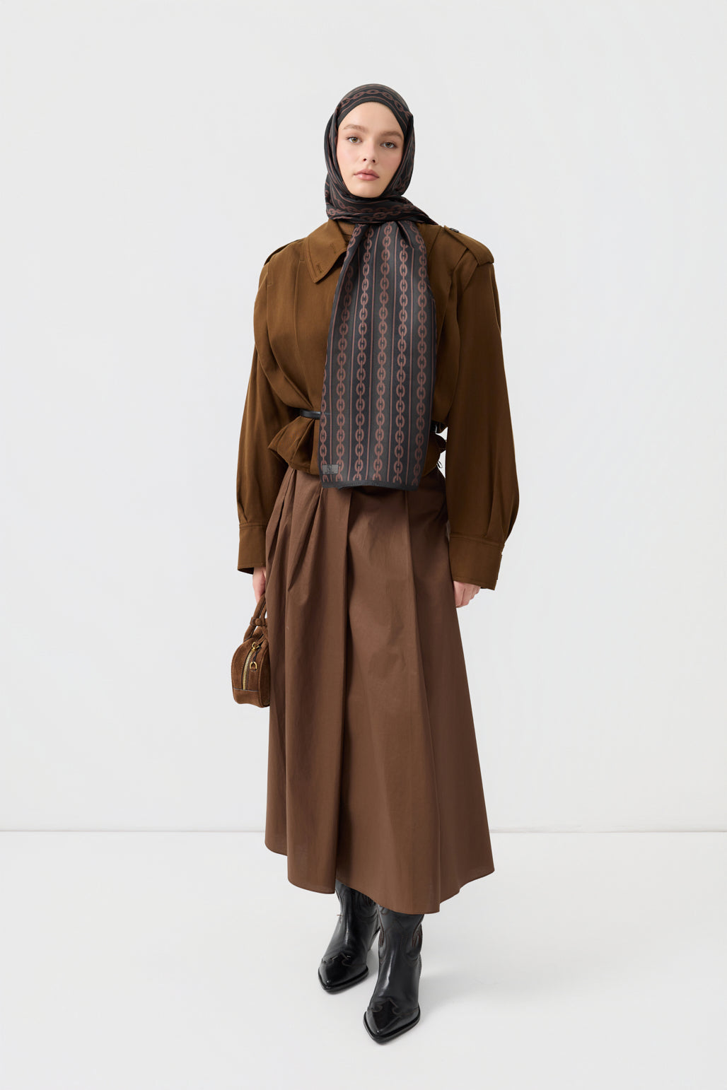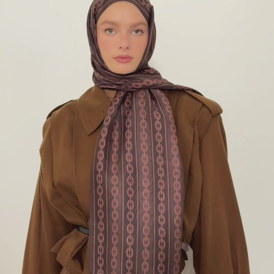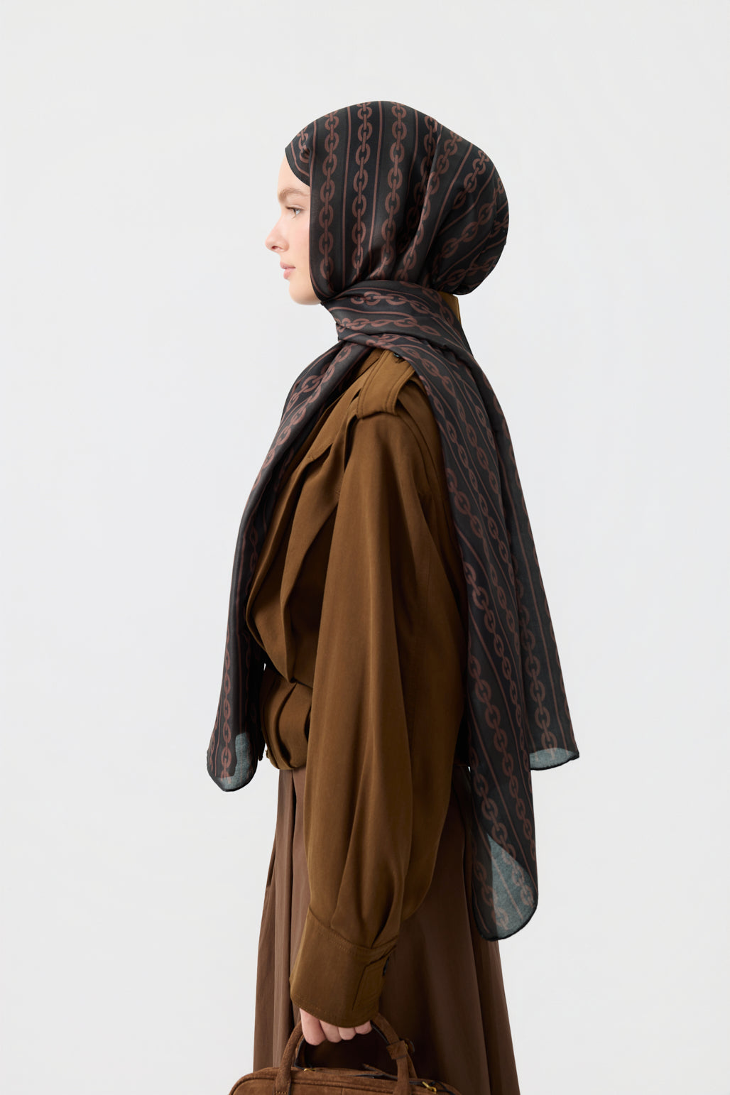 Cotton Twill Şal Chain Kahve modern ve zincir motifli desenleriyle tarzınızı yeniden şekillendirirken, tok ve akıcı twill dokusuyla şıklığınızı konforlu bir kullanım deneyimiyle bir araya getirir. Yüksek kaliteli pamuklu kumaşın hafifliği ve üstün hava geçirgenliği, cildinize nazikçe temas ederek gün boyu ferah bir his sunar. Chain serisinde titizlikle seçilmiş renk seçenekleri, her zevke ve tarza hitap ederek kombinlerinize dinamizm ve zarafet katar. Kayma yapmayan ve kolay şekil alan yapısıyla pratik bir kullanım sağlar. 70x185 cm ölçüleriyle farklı bağlama stillerine uyum sağlayarak her zevke uygun bir seçenek sunar. Günlük kombinlerden özel davetlere kadar her ortamda tarzınızı tamamlayan bu çok yönlü şal, ince detayları ve üstün işçiliğiyle gardırobunuzun vazgeçilmez parçalarından olmaya aday.