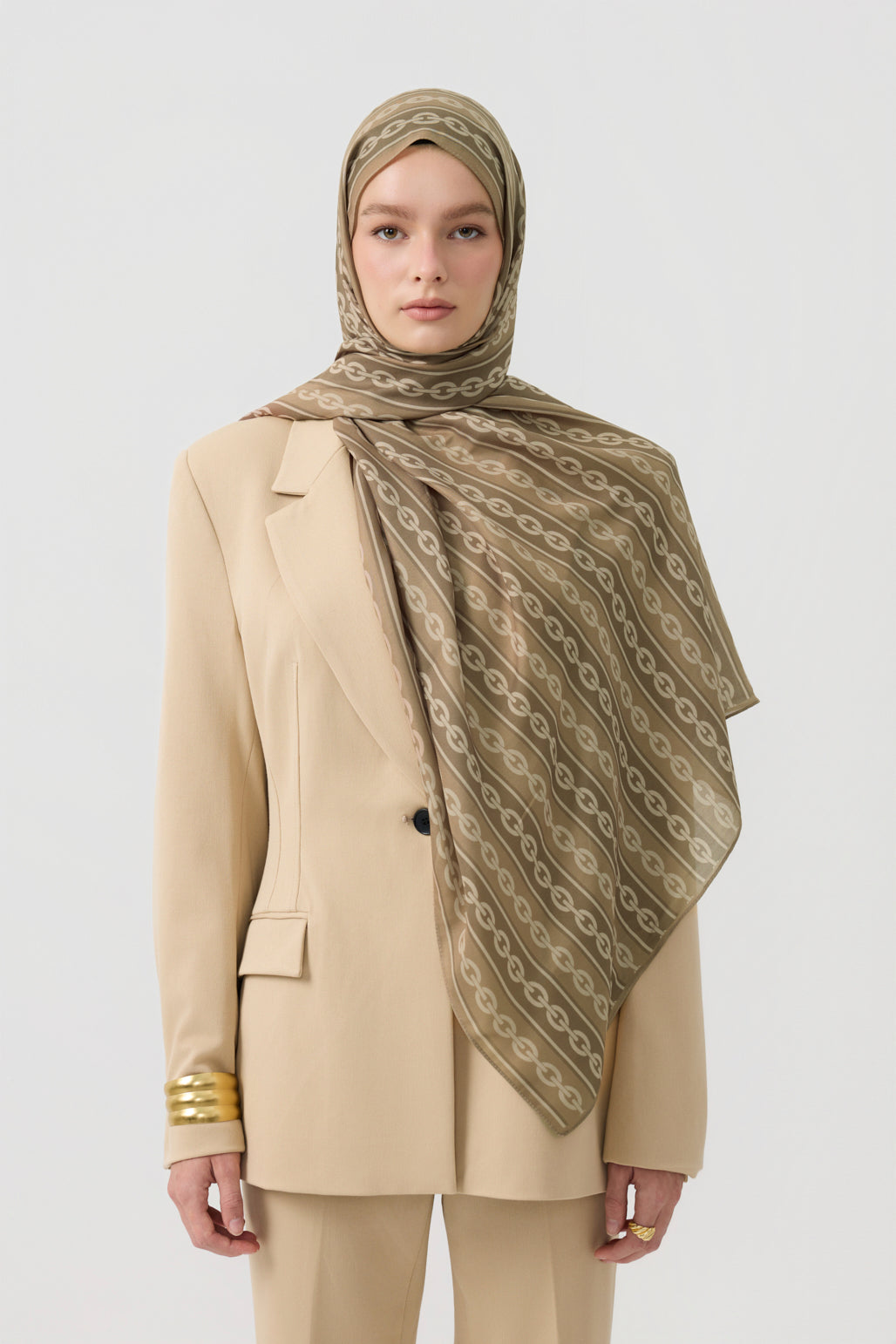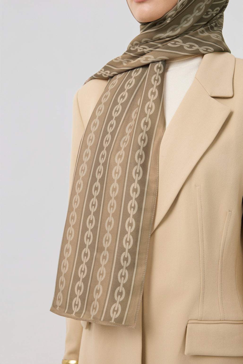 Cotton Twill Şal Chain Yağ Yeşili, modern ve zincir motifli desenleriyle tarzınızı yeniden şekillendirirken, tok ve akıcı twill dokusuyla şıklığınızı konforlu bir kullanım deneyimiyle bir araya getirir. Yüksek kaliteli pamuklu kumaşın hafifliği ve üstün hava geçirgenliği, cildinize nazikçe temas ederek gün boyu ferah bir his sunar. Chain serisinde titizlikle seçilmiş renk seçenekleri, her zevke ve tarza hitap ederek kombinlerinize dinamizm ve zarafet katar. Kayma yapmayan ve kolay şekil alan yapısıyla pratik bir kullanım sağlar. 70x185 cm ölçüleriyle farklı bağlama stillerine uyum sağlayarak her zevke uygun bir seçenek sunar. Günlük kombinlerden özel davetlere kadar her ortamda tarzınızı tamamlayan bu çok yönlü şal, ince detayları ve üstün işçiliğiyle gardırobunuzun vazgeçilmez parçalarından olmaya aday.