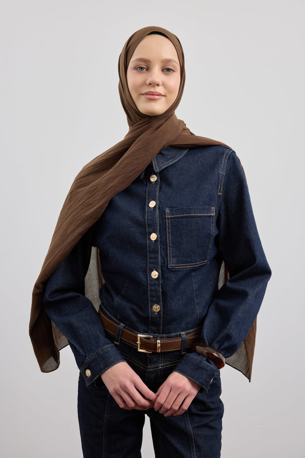 Organik Crash Şal Acı Kahve, pamuklu dokusuyla hafifliği ve nefes alabilir yapıyı bir araya getirir. Cilde temas eden yumuşak yüzeyi gün boyu rahatlık sunarken, organik yapısı doğal bir zarafet katar. Kendine özgü kırışık dokusu ütü gerektirmeden kullanılabilir, şehir hayatının temposuna kolayca uyum sağlar. Hafif yapısıyla yaz günlerinde ferahlık, serin akşamlarda ise zarif bir tamamlayıcı olur. Günlük kombinlere modern bir dokunuş katar, özel günlerde de sade bir şıklık sunar. Doğal formu ve pratik kullanımıyla Organik Kırışık Şal, gardıroplarda zamansız bir yer edinir.