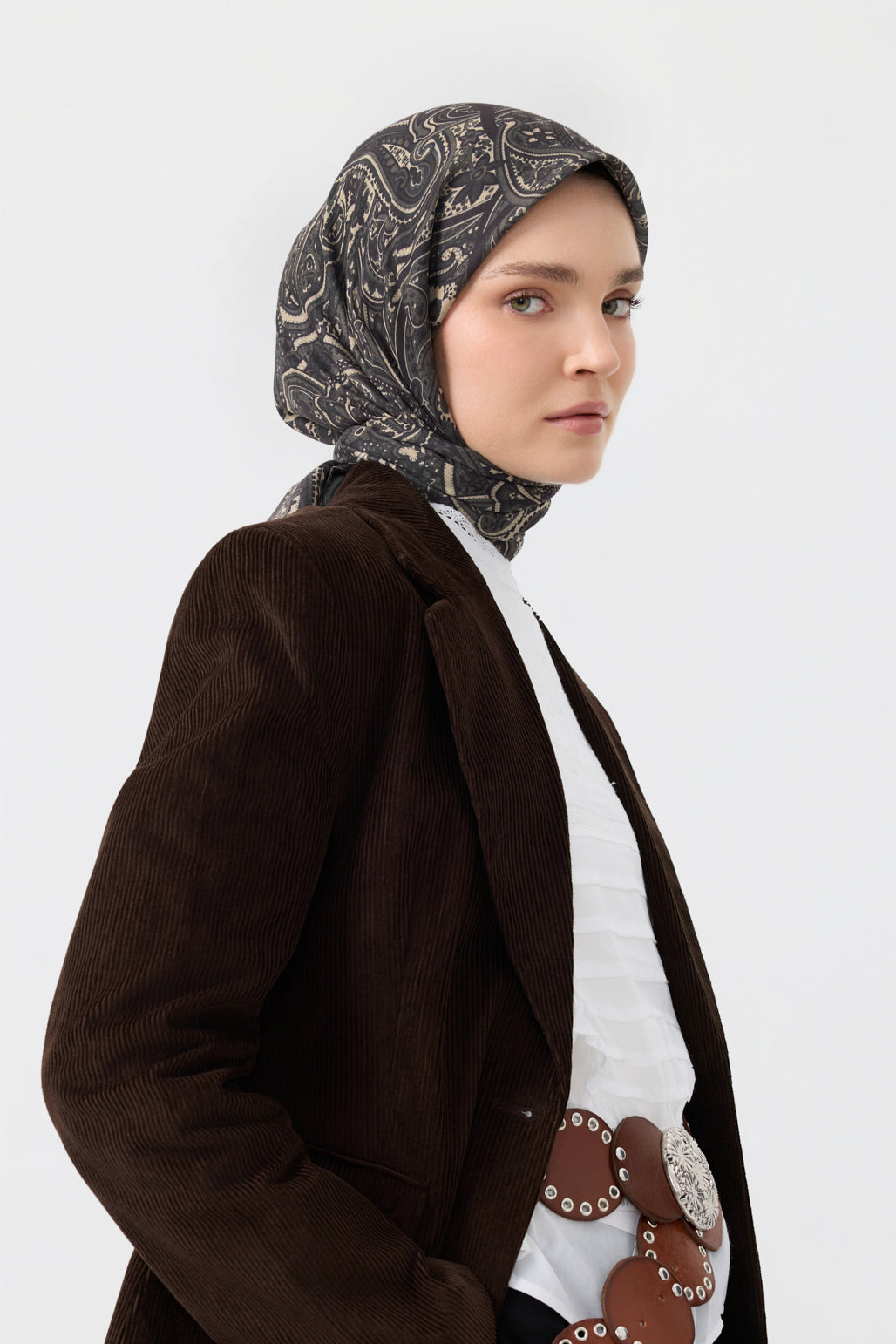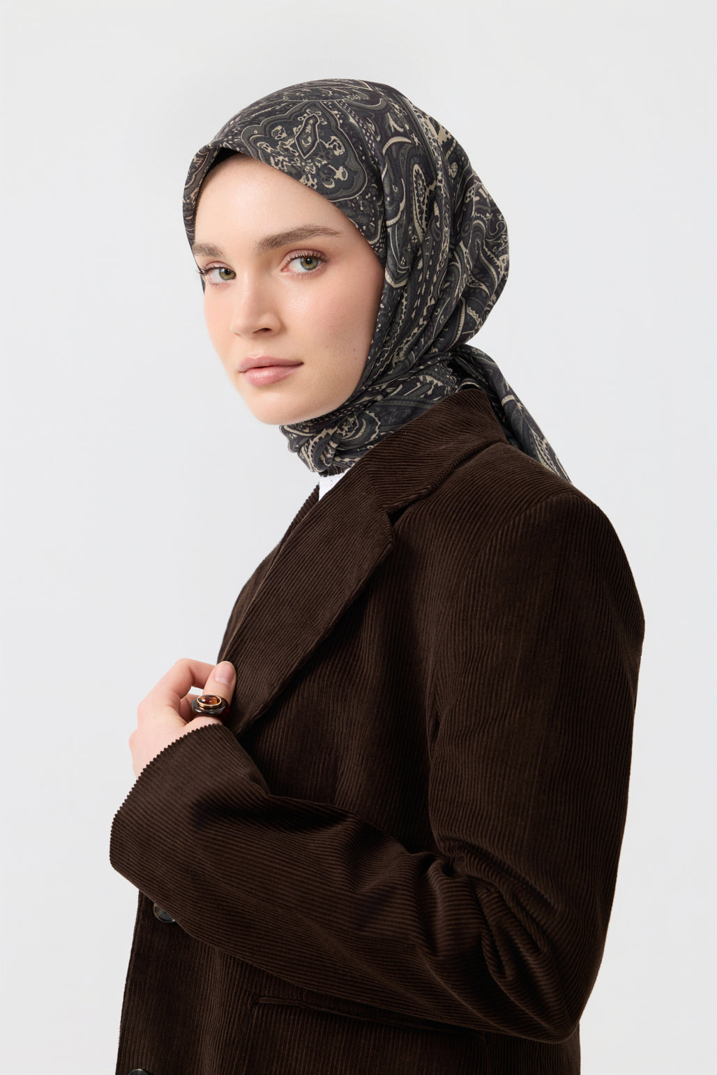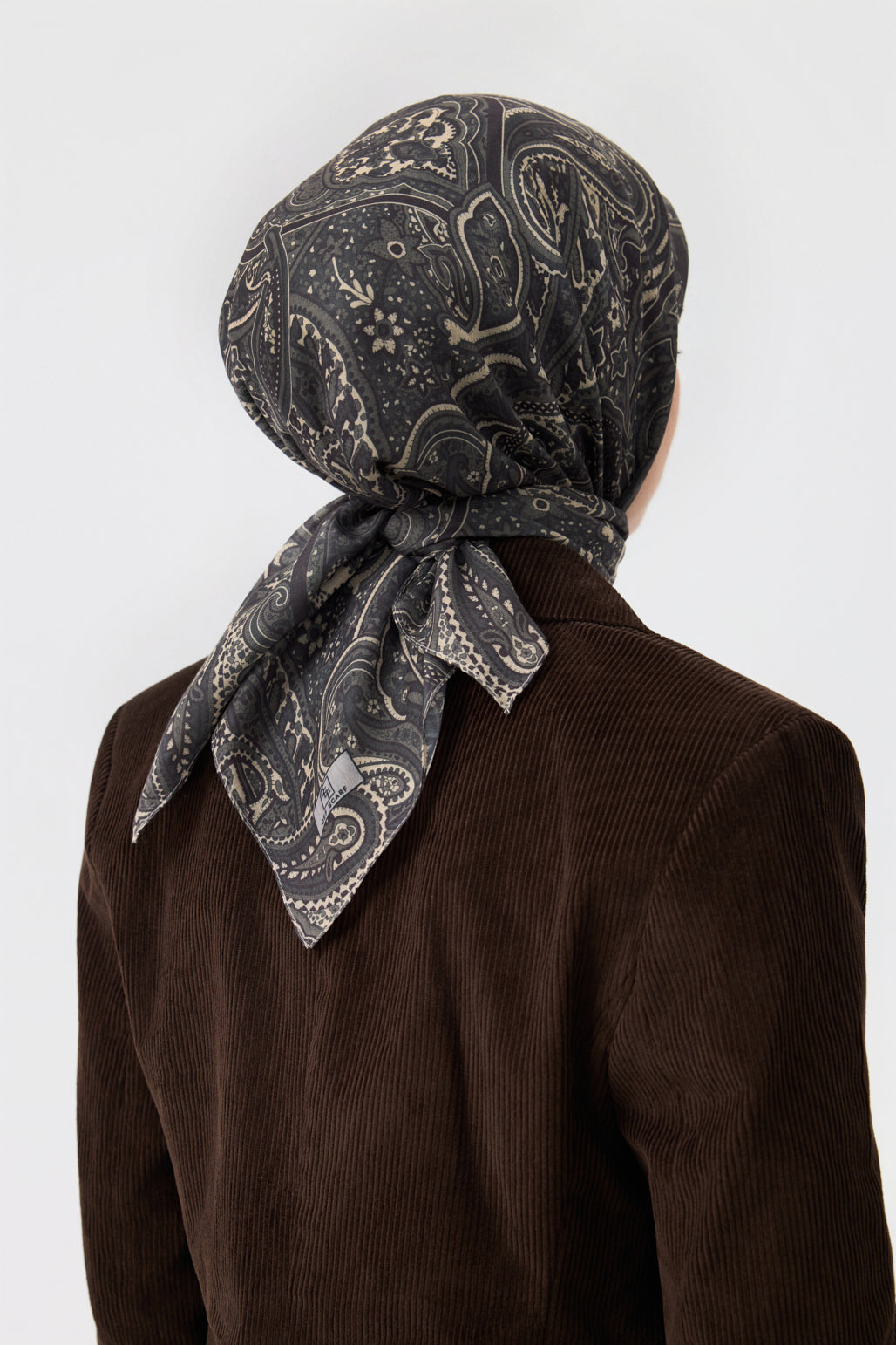 Desenli Pamuk Eşarp - Magic Desen Serisi, kumaşın üzerinde adeta zarifçe dans eden karmaşık paisley motifleri ile öne çıkmaktadır. Desenlerin yumuşak dokusal geçişleri, serideki modellere adeta bir sanat eseri gibi hareketlilik katarken, çizgiler ve çiçeksi detaylar eşarbın tasarımına uyumlu bir derinlik kazandırır.